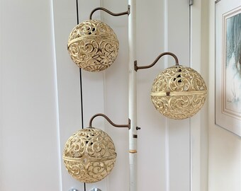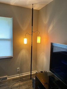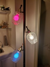 I have a tension pole lamp that seems to be quite old, the lamp is white mid section whtere the angels and lamps are and gold at top and bottom. Lampshade is made of glass. Each lamp contains a plastic insert that softens the light and gold colored cages with daisy petals attached to them with. Vintage retro mcm tension pole 3 light fixture lamp 8 ft ceiling. Hollywood regency, mid century modern, danish modern, eames era.